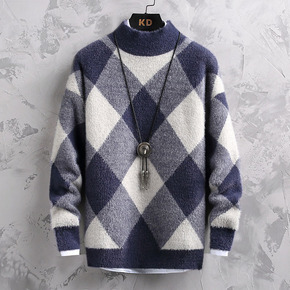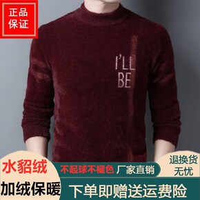 秋冬季仿水貂绒毛衣男加厚加绒个性半高领打底衫中年男...