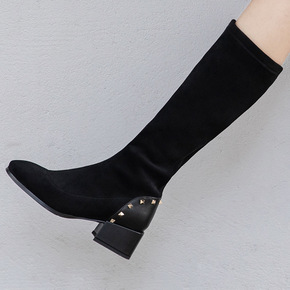批发女鞋方头秋冬高筒骑士靴女不过膝厚底粗跟方头瘦瘦...