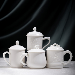 赢匠浮雕羊脂玉白瓷办公杯陶瓷带盖领导总裁水杯商务周...