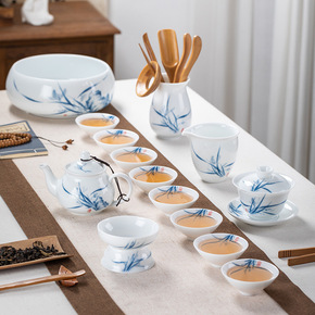 青花瓷功夫茶具套装手绘兰花陶瓷茶壶盖碗普洱斗笠茶杯...