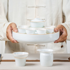 甜白瓷功夫茶具茶盘套装家用简约办公室茶船盖碗斗笠茶...