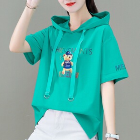 纯棉短袖连帽衫卫衣女夏季年新款韩版潮宽松百搭半袖T...