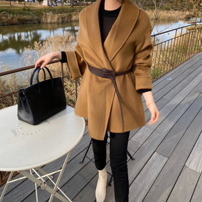 反季促销2022秋冬新款宽松双面羊大衣女皮腰带短款...