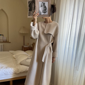 温柔气质复古双面毛呢外套女22秋冬无领直筒宽松系带...