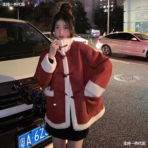 皮毛一体棉衣外套冬季2021新款加绒加厚洋气新年红...