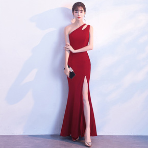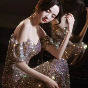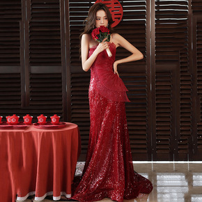 主持人一字肩年会晚礼服女2021新款亮片大气优雅仙...