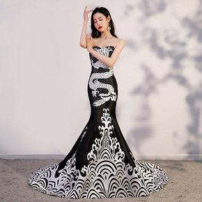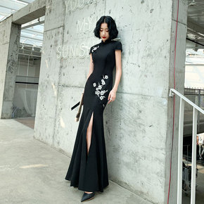 黑色鱼尾旗袍长款女气质复古中国风晚礼服改良版连衣裙...