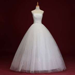 批发2104一字肩珍珠齐地婚纱平肩影楼大码绑带绑带...