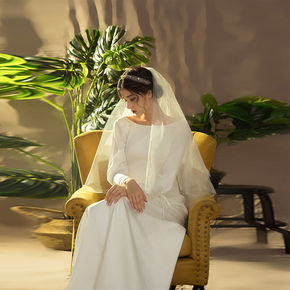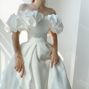 法式轻婚纱 新款夏赫本珍珠泡泡袖礼服缎面鱼尾气质显...