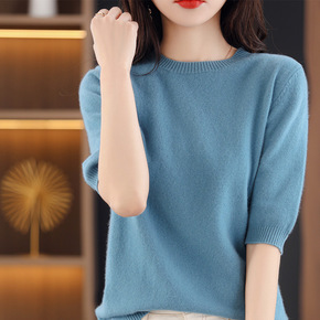 春夏宽松百搭羊毛针织短袖女士大码圆领纯色打底衫针织...