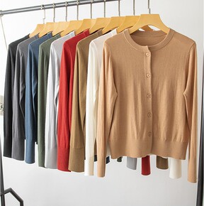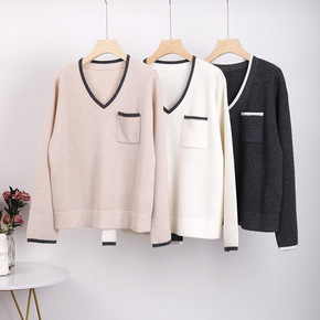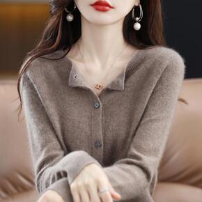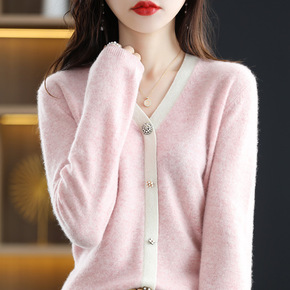 韩版V字领简约拼色花扣女士开衫通勤优雅全羊毛秋冬新...