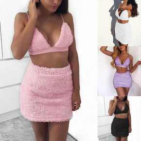 2018速卖通WISH春夏季套装 性感吊带裹胸绒毛...
