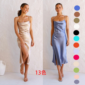 13色跨境货源吊带长裙亮面弹力缎面开叉长裙欧美亚马...