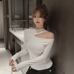 黑色t恤女长袖黑色韩版修身露肩上衣女2021秋冬打...