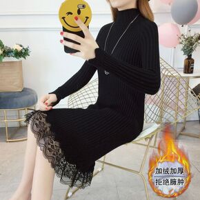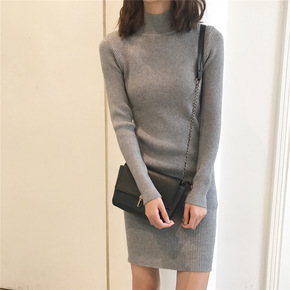 毛衣裙女秋季新款中长款半高领修身打底连衣裙学生毛针...