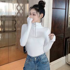 秋冬新款2020大码女装半高领圆环拉链短款紧身修身...