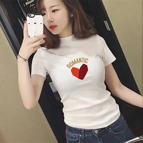 韩版纯色半高领印花短袖简约百搭修身打底衫纯棉显瘦t...