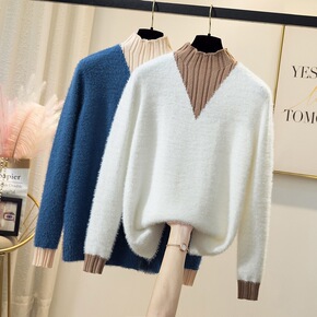 拼色条纹女毛衣2021秋冬新款半高领套头针织衫宽松...