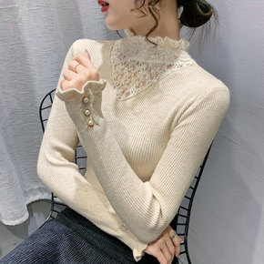 女士假两件毛衣女蕾丝针织衫早秋女装上衣2021年新...