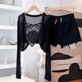 黑色冰丝针织开衫女夏季v领长袖高腰短款外搭披肩空调...
