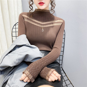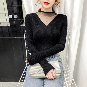 镂空网纱半高领亮丝针织打底衫女秋装2021年新款短...