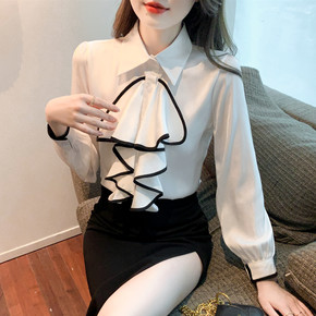 春季荷叶边红色衬衣女2022年新款时尚洋气雪纺衬衫...