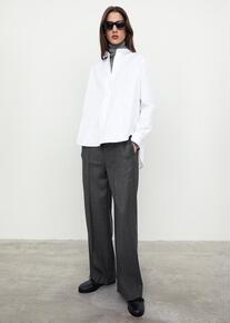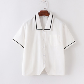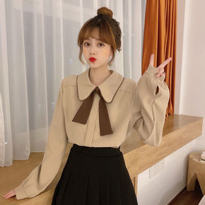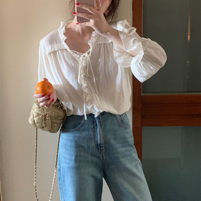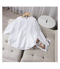 日系风格 个性宽松圆领长袖白色棉质衬衣女2021春...