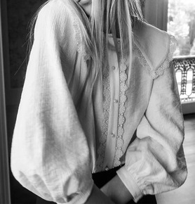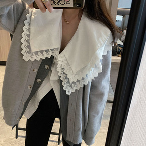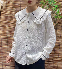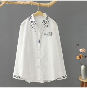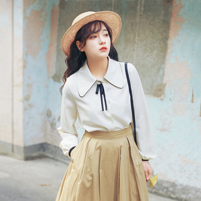 布衣格文艺甜美刺绣花边娃娃领打底衬衣秋冬新款白色棉...