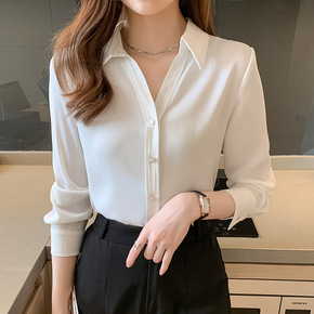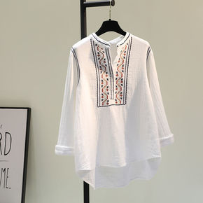 立领白色衬衫女 春秋韩版新疆纯棉休闲百搭v领宽松上...