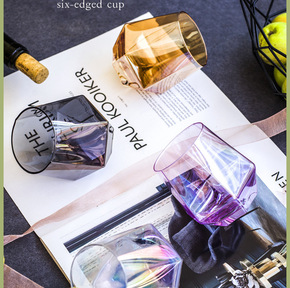 创意水晶玻璃简约几何六角杯家用炫彩镭射威士忌酒杯冷...