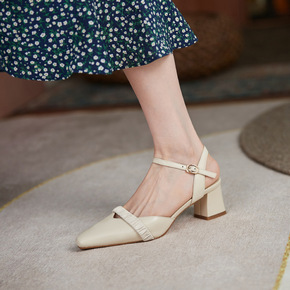 瑞百丽拉2021夏季新品粗跟方头凉鞋女包头后空大码...