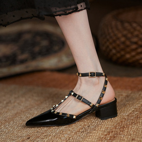 瑞百丽拉2021夏季新品粗跟尖头凉鞋女大码黑色白色...
