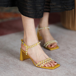 瑞百丽拉2021夏季新品粗跟方头露趾凉鞋女一字扣米...