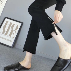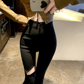 十三行 高腰黑色打底裤女镂空破洞小个子百搭微喇裤拖...