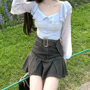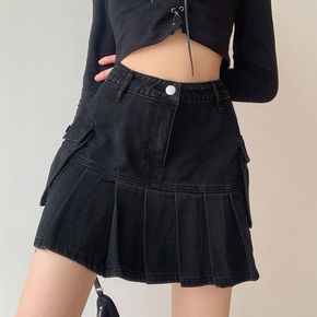大码胖高腰超短辣妹字半身裙春季复古牛仔百褶裙子...