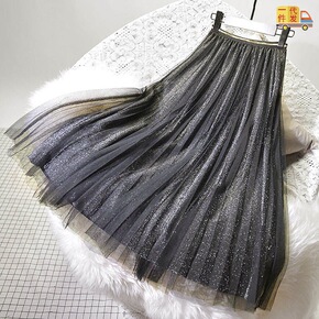 网纱半身裙两面穿金丝绒网纱半身裙女春秋新款高腰字百...