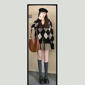 甜辣风菱格针织开衫套装女秋辣妹高腰百褶半身裙洋气毛...