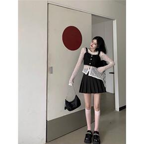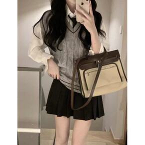 学院风长袖衬衫背心马甲百褶裙半身裙时尚套装女早秋2...