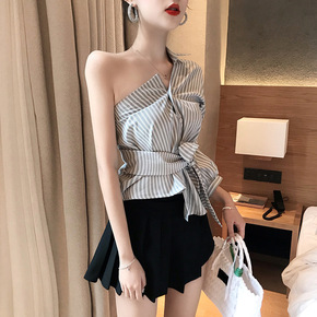 时尚套装女新款设计感性感露肩条纹衬衫+百褶高腰显瘦...