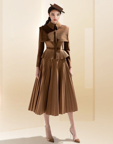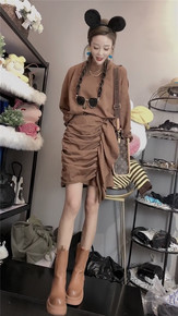 2021秋冬新款百褶麂皮卡其色上衣大摆压褶气质半身...