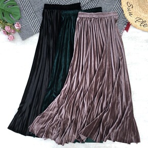 实拍欧美跨境半身裙秋冬金丝绒百褶裙拖地长裙金属色大...