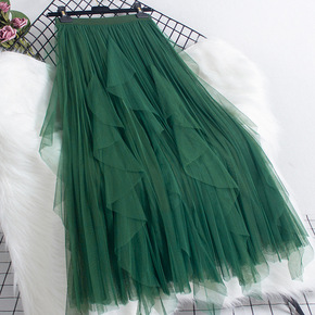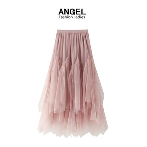 花瓣网纱裙女2021秋冬新款中长款高腰显瘦半身裙荷...