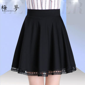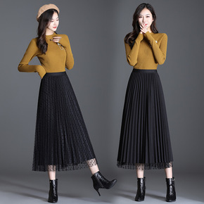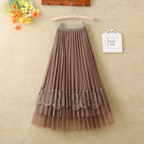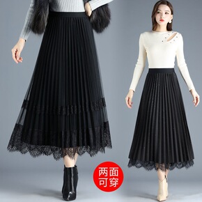 两面穿蕾丝打珠百褶裙中长大摆高腰网纱半身裙a字长裙...