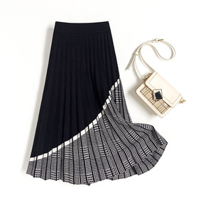 2021秋冬新款时尚针织百褶裙长裙千鸟格格纹拼接半...