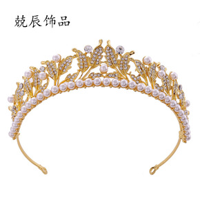 新款欧美大气跨境高档叶子水钻新娘皇冠合金珍珠公主结...
