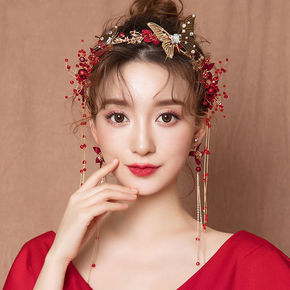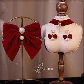新娘敬酒服头饰复古酒红色绒布蝴蝶结发夹耳环项链套装...