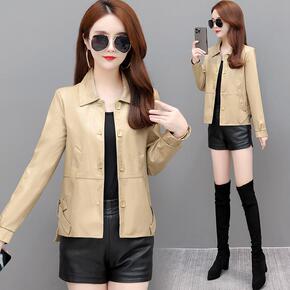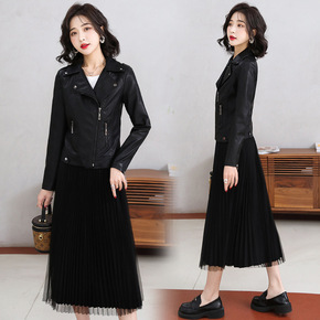 2020秋装新款女式皮衣翻领中长款修身机车夹克PU...