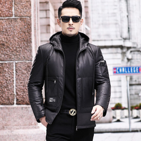 海宁真皮羽绒服男短款连帽修身青年头层牛皮衣油蜡外套...