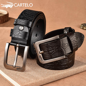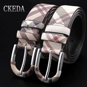男士女真皮腰带针扣青年情侣格子纹休闲牛皮裤带商务英...