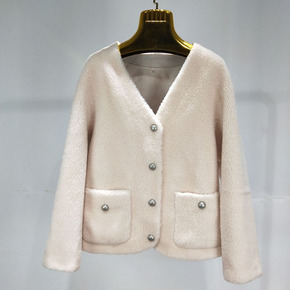 反季清仓小香风短款羊剪绒大衣女V领全羊毛海宁皮草皮...